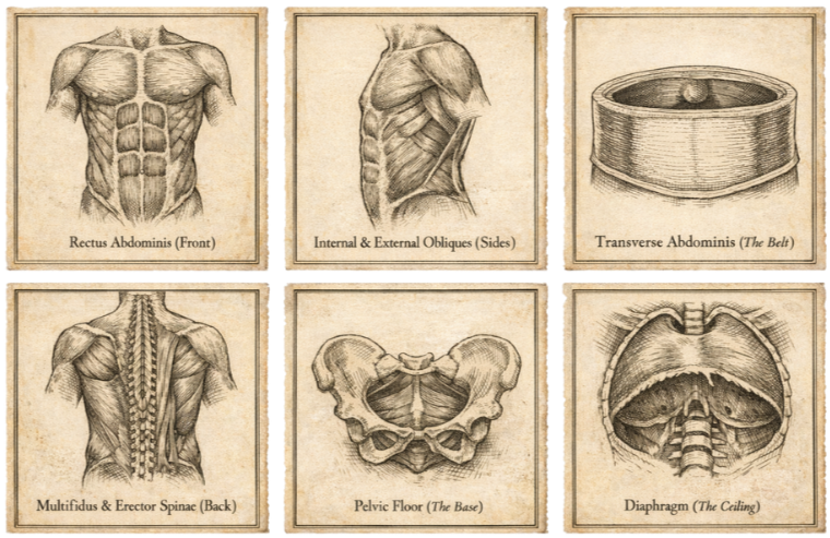 The term “core” is often used loosely, but anatomically it refers to a group of muscles that surround, stabilize, and coordinate movement in the trunk and pelvis. These include, but are not limited to, the rectus abdominis (front), internal and external obliques (sides), transversus abdominis (belt that wraps around), multifidus, erector spinae (back), pelvic floor (the base) and the diaphragm (ceiling). On the left, you’ll see a diagram generated by ChatGPT to help visualize these muscles.